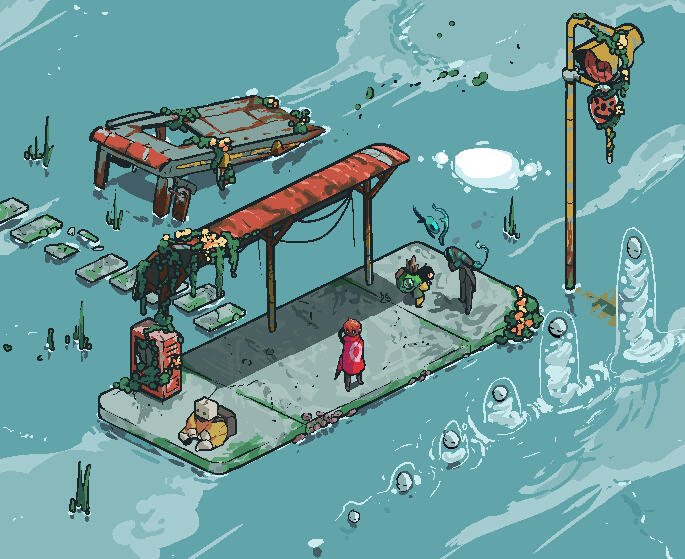 The world of Wake is about the people who survive in separated communities drifting aimlessly through a world that's full of strange beasts, ancient automata, and mysterious deities.People make their homes among the ruins of overgrown cities long abandoned. They scavenge the ruins for useful artifacts and lost knowledge, but have also begun rebuilding their own little societies to try and create a stable foothold where the old world obviously failed.The deities are beings created by the willpower of humans. They are ideas given form when given a name, like a contract being signed to give it power. They have created their own societies and families among Wake, at times copying the way humans live, and at others finding a seemingly non-sensical way of living, though you'll also find humans who do the same.